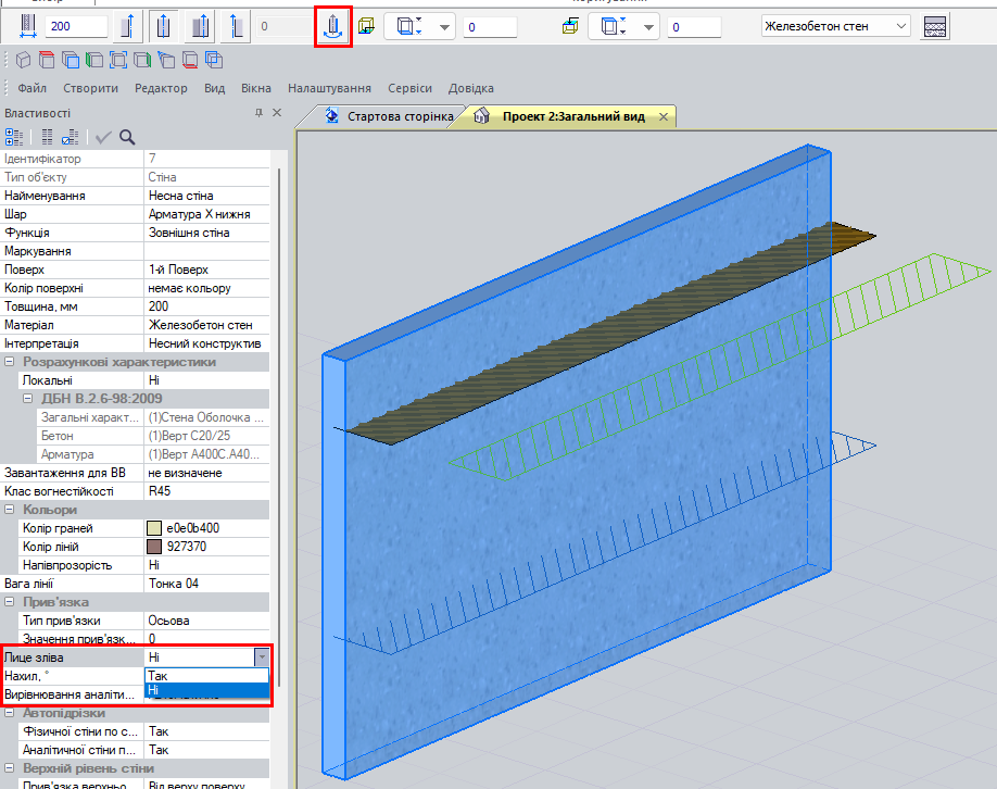 У властивостях стіни можна опційно перемкнути напрямок лицьового боку так, що він буде ліворуч від осьової. Можна також інвертувати напрямок осьової лінії.