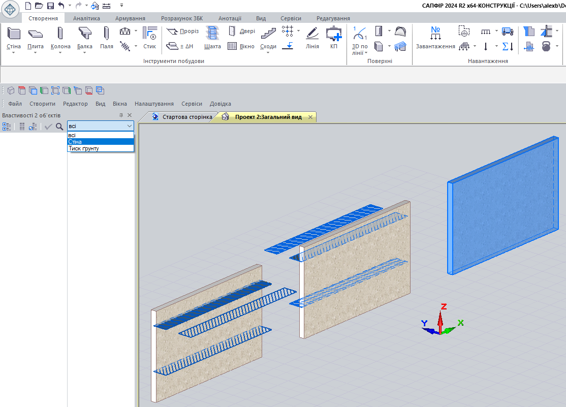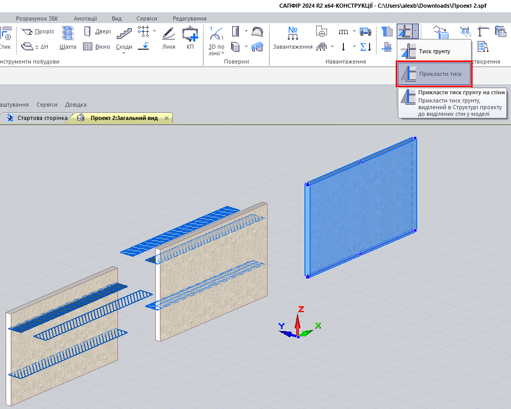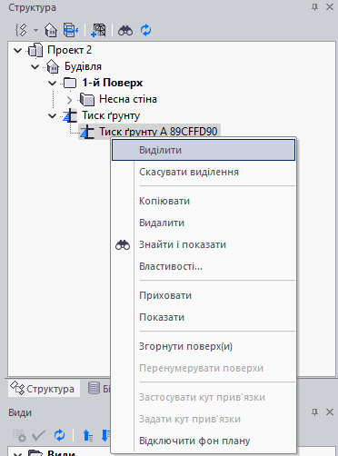 Як виділити тиск грунту? Якщо тиск грунту вже прикладено до якихось стін, то його можна бачити в графічному вікні у вигляді смужечок біля стін з того боку, звідки тисне грунт. У цьому разі можна вказувати тиск грунту, тикаючи мишею в ці смужки. Якщо тиск грунту ще не прикладався до жодної стіни, а тому його не видно в графічному вікні, його можна виділити за командою "Виділити" контекстного меню, доступного за правою кнопкою миші у вікні "Структура проєкту", де слід вибрати елемент інформаційної моделі типу "Тиск грунту".