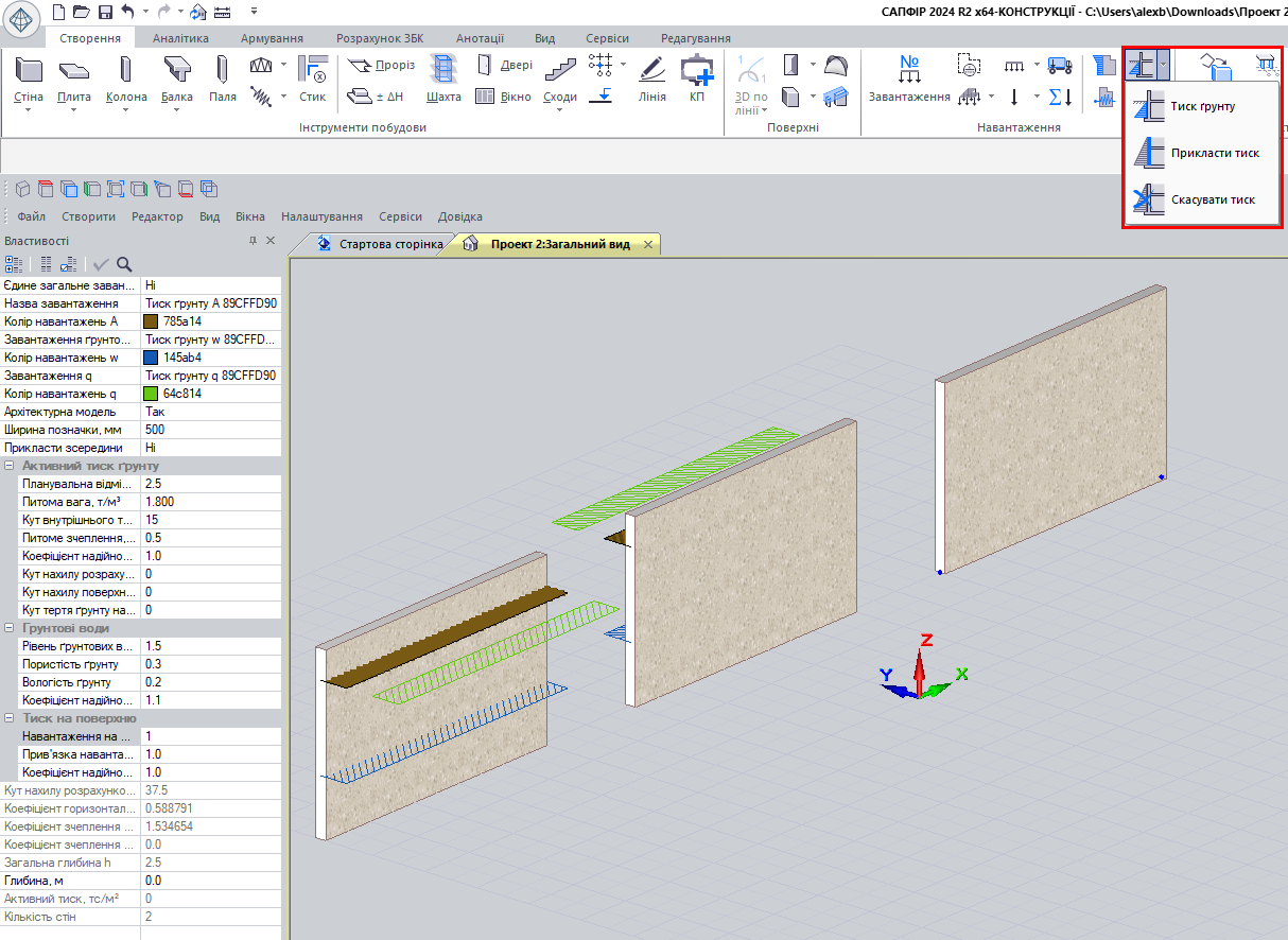 Прикласти тиск – команда дає змогу прикласти тиск грунту (вже наявний у моделі, раніше створений за командою "Тиск грунту") до наявних у моделі елементів типу "Стіна". Для цього потрібно виділити стіни і тиск грунту. Потім дати команду "Прикласти тиск". Виділений тиск буде прикладено до виділених стін.