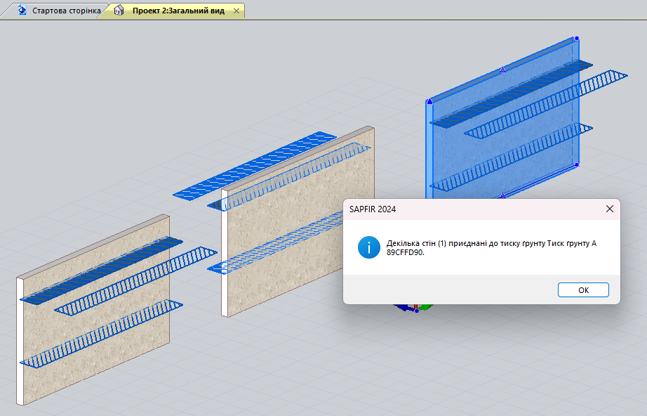 У разі успішного виконання команди можна побачити результат у вигляді "смужок" у графічному вікні та отримати відповідне повідомлення від програми із зазначенням кількості елементів типу "Стіна", до яких було прикладено тиск ґрунту.