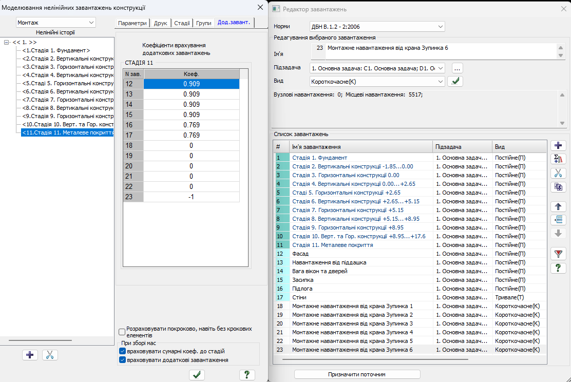 Для кожної стадії заповнюється таблиця Коефіцієнтів врахування додаткових завантажень (рис.2).