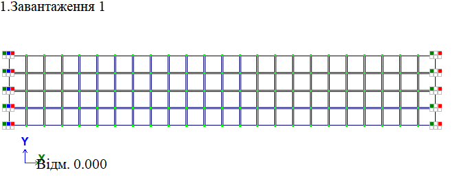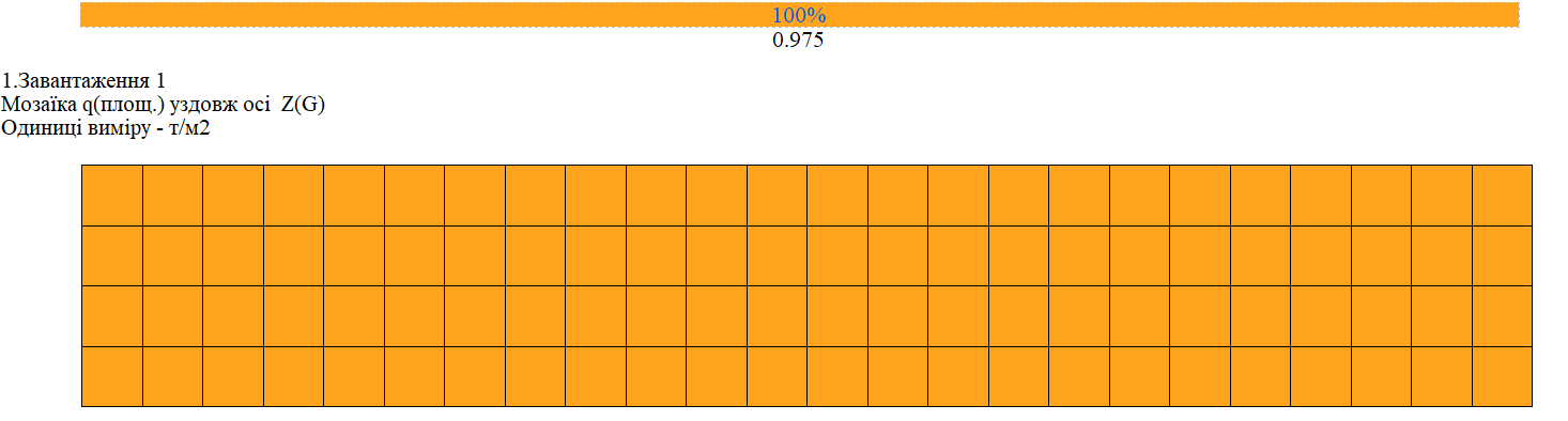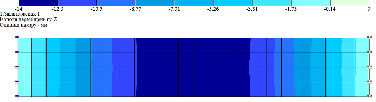 Як видно, за результатами розрахунку прогин плити приблизно відповідає прогину при випробуваннях. Невелика різниця (0.4 мм) пояснюється тим, що в розрахунковій моделі прогін плити прийнятий не 7.15 м як при випробуваннях, а 7.2 м.
