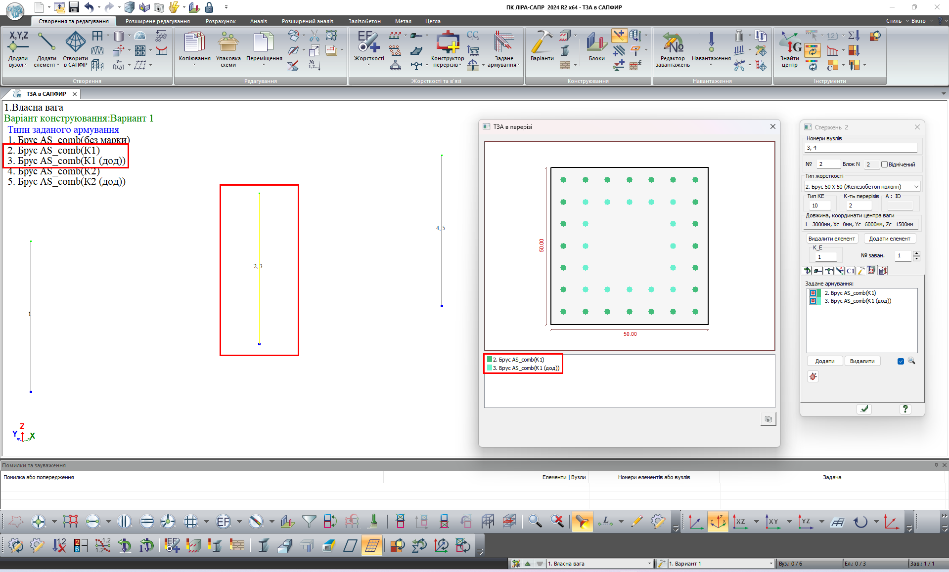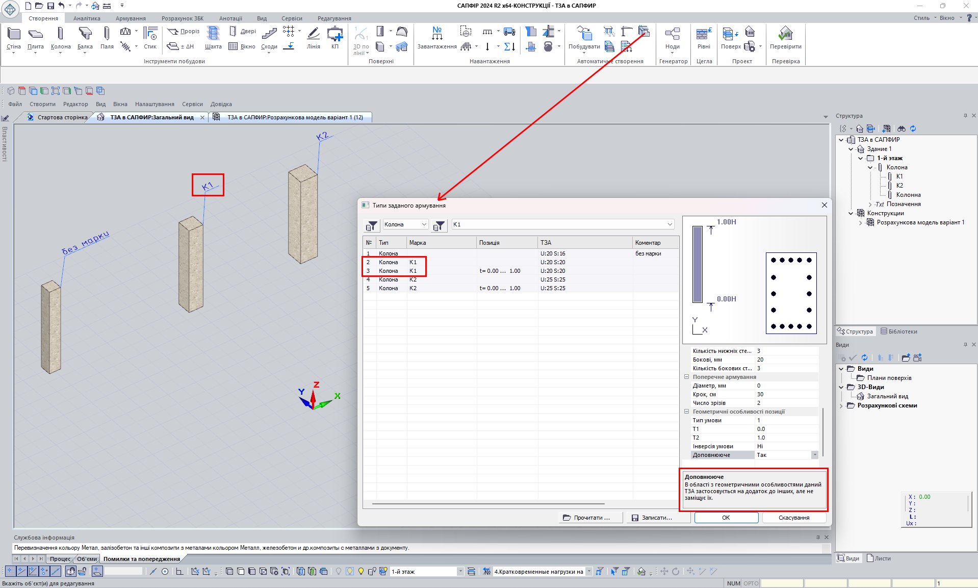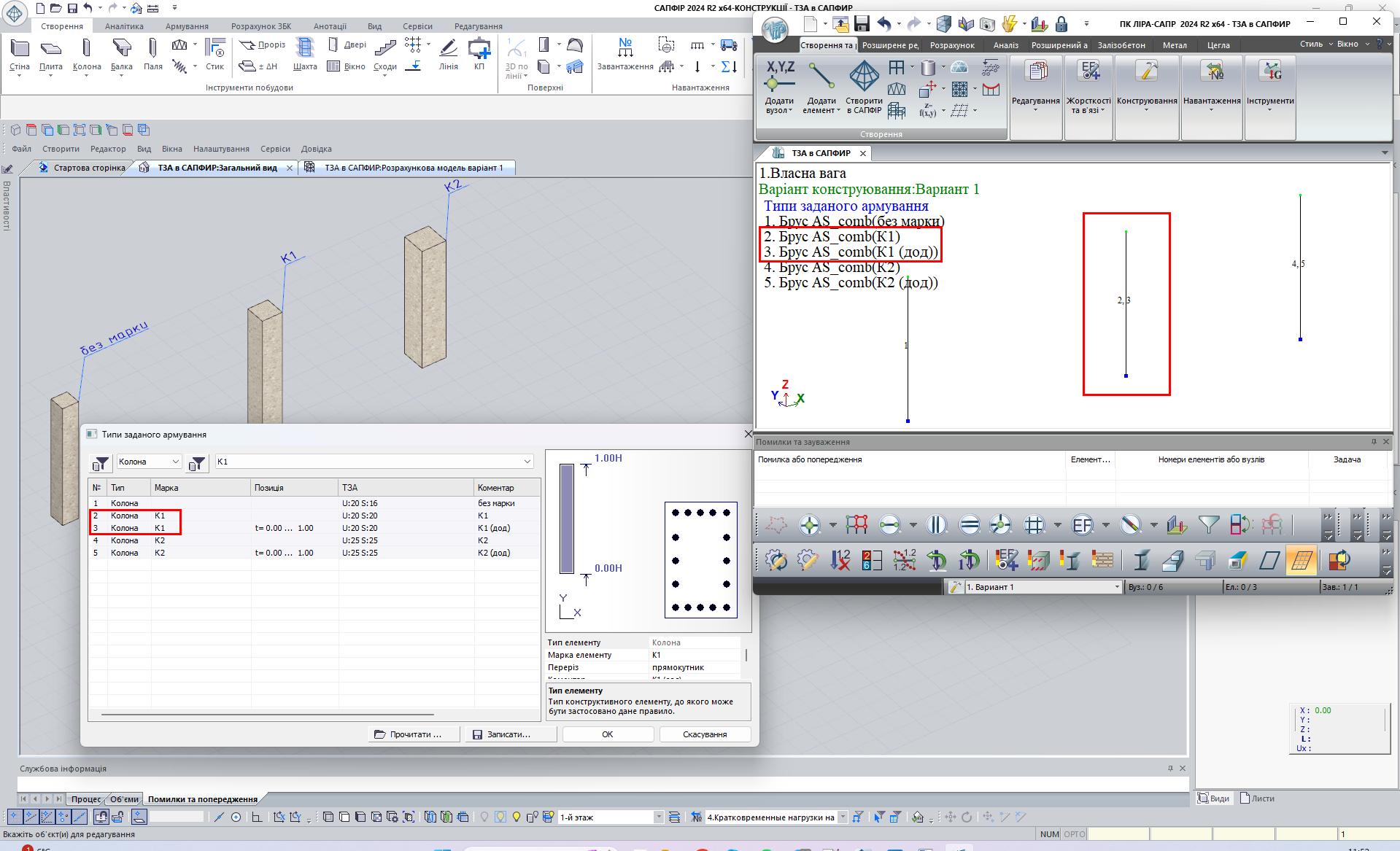 В результаті колони К1 і К2 отримали по два ТЗА, що можна спостерігати у ЛІРА-САПР (див. рис. 3).