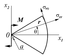 До вершини клину одиничної товщини прикладено зосереджений згинальний момент M, що діє в площині клину.