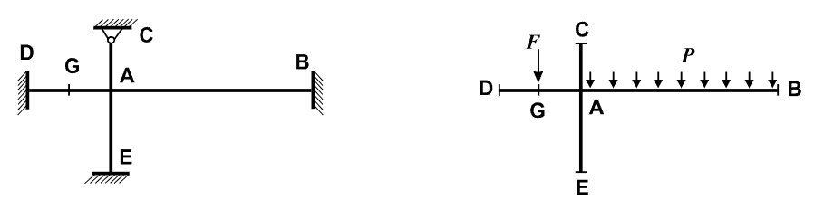 У середині лівого прольоту горизонтального стержня (точка G) прикладена вертикальна зосереджена сила F на правому прольоті горизонтального стержня (AB) розташована вертикальна рівномірно розподілене навантаження p.