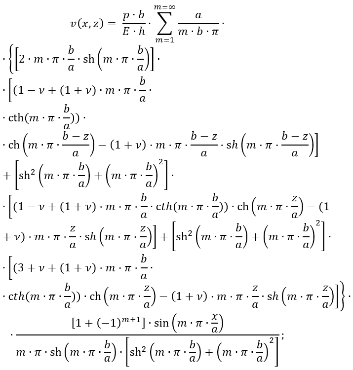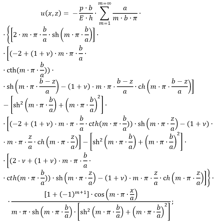 Компоненти тензора переміщення у декартових координатах u(x,z) та v(x,z) для серединної поверхні балки-стінки в її площині можуть бути обчислені за такими формулами: