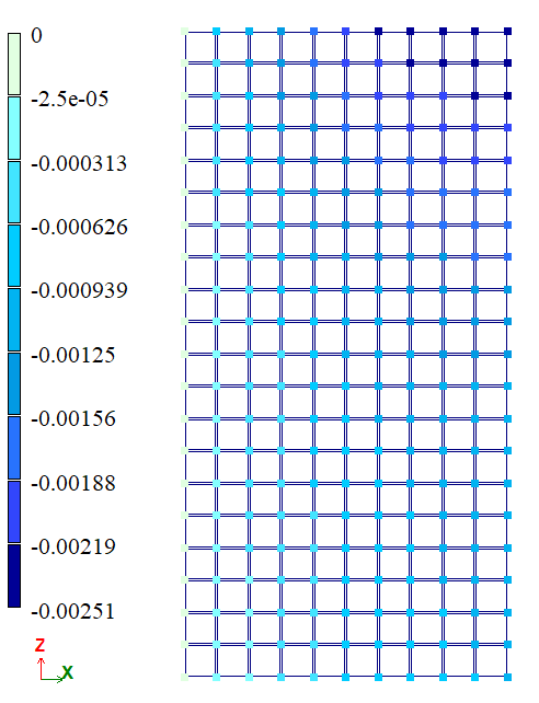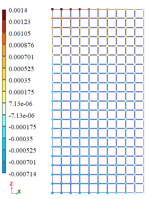 Розрахункова схема - плоска пластинна система, задана генерацією балки-стінки. Сітка сінченних елементів розбита з кроком 0,08 м у напрямках осей X та Z загальної системи координат.