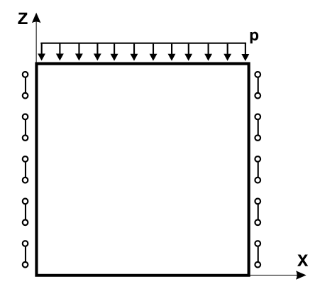 До верхньої сторони прямокутної балки-стінки, жорстко підвішеної з боків, прикладено рівномірно розподілене навантаження P, що діє в площині балки-стінки по осі Z.