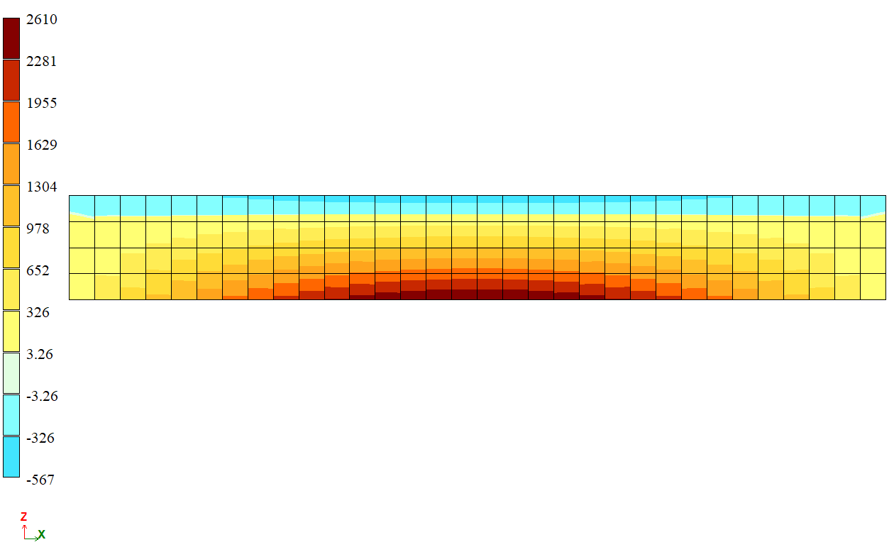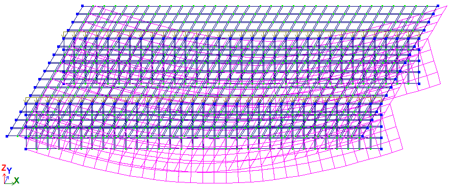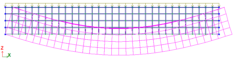 Розрахункова схема - система загального вигляд. Сітка кінцевих елементів розбита в напрямку поперечної балки з кроком 0,25 м і в напрямку вздовж балки з кроком 0,2453125 м. Напрямок видачі внутрішніх зусиль зорієнтований вздовж осі OX загальної системи координат.