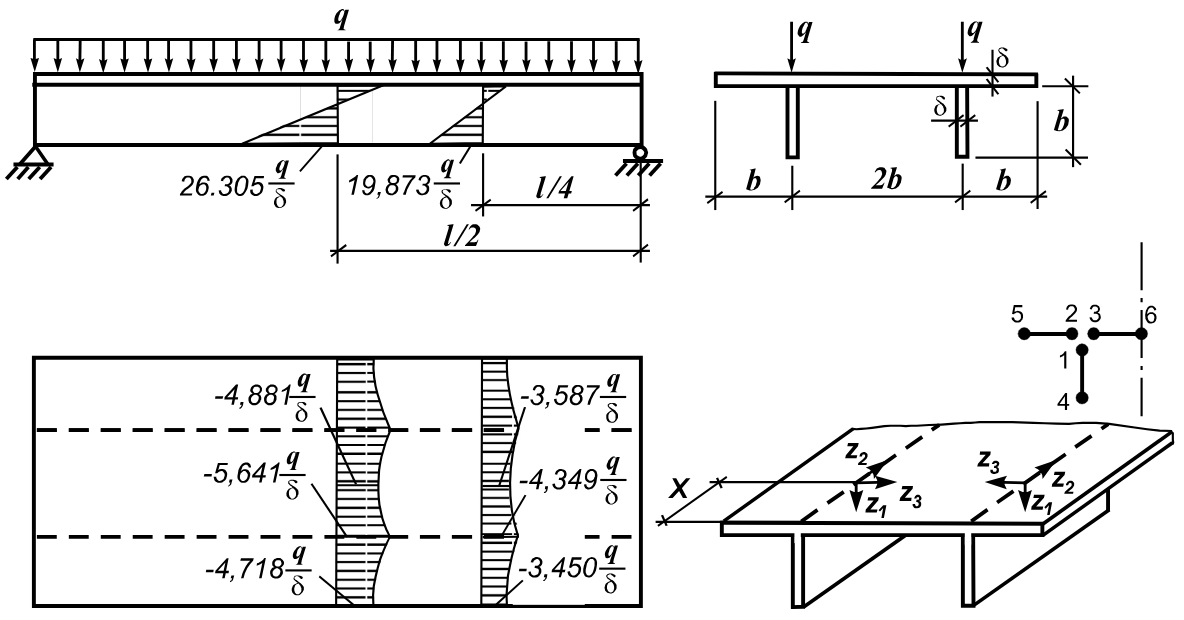 Визначити нормальне напруження σxi, що діє вздовж балки, в елементах її конструкції в точках поперечного перерізу i = 1, 4, 5, 6 для половини (l/2) та чверті (l/4) прольоту балки при врахуванні наступних припущень, прийнятих при виведенні аналітичного рішення: