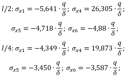 Нормальні напруження σxi (кН/м2), що діють вздовж балки, в елементах її конструкції в точках поперечного перерізу i = 1, 4, 5, 6 для половини (l/2) і чверті (l/4) прольоту балки при врахуванні семи гармонік невідомих узагальнених переміщень можуть бути обчислені за такими формулами: