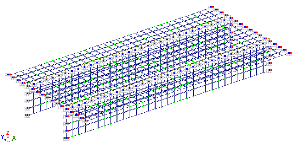 Забезпечення граничних умов досягається за рахунок накладання в'язів за напрямами ступенів свободи Y вздовж ребер; Y, Z по краях, паралельних OY; X, Y, Z на початку координат.