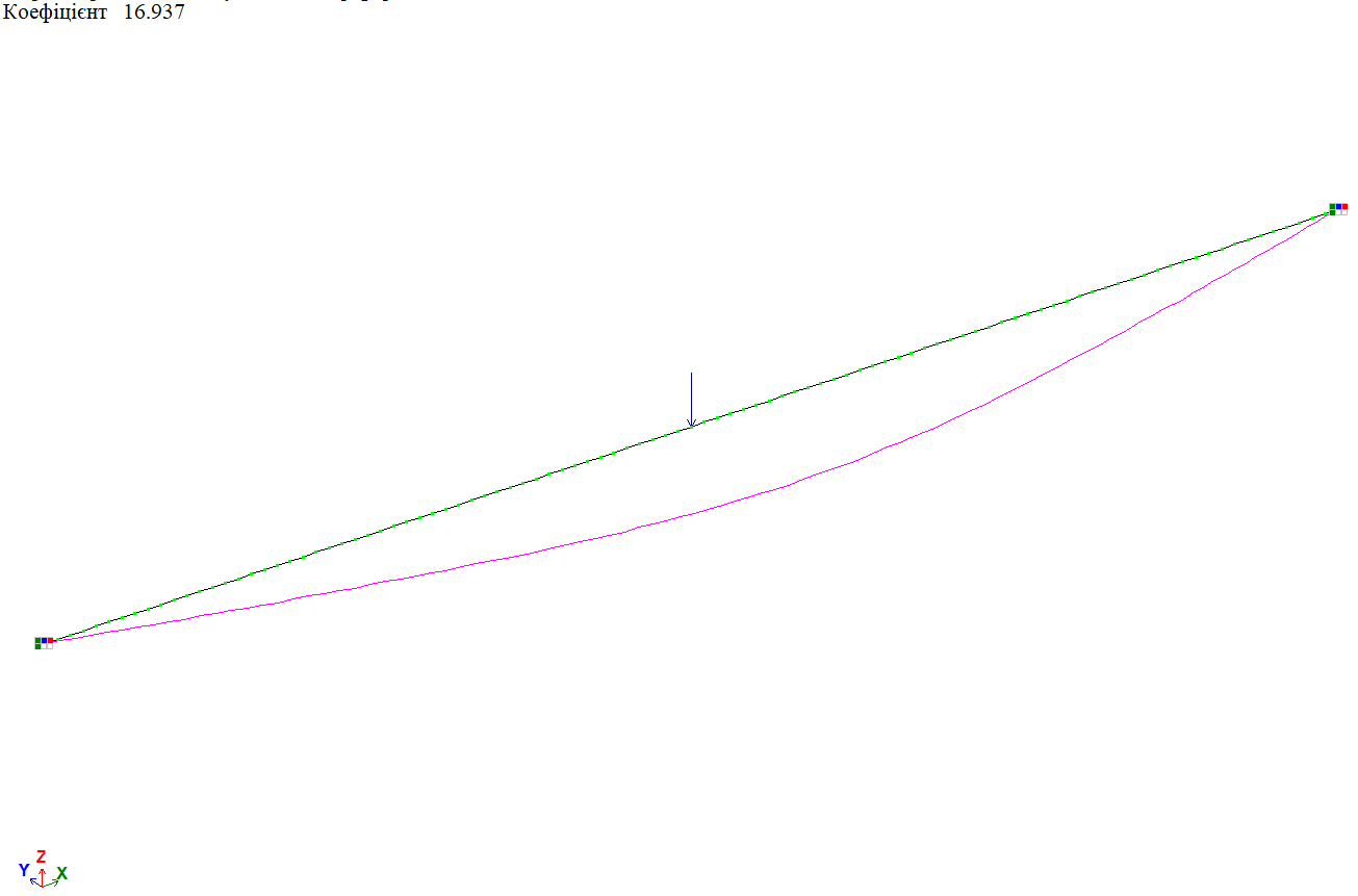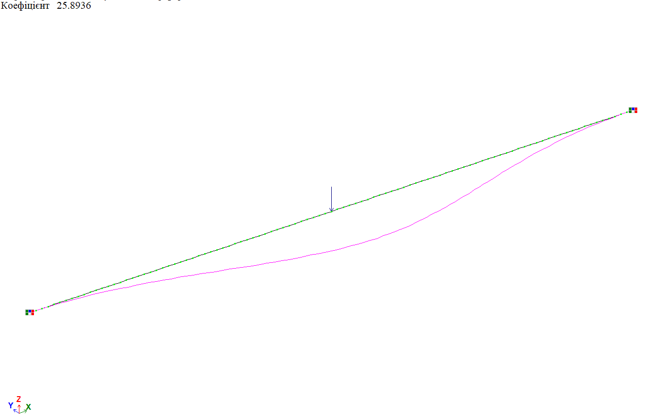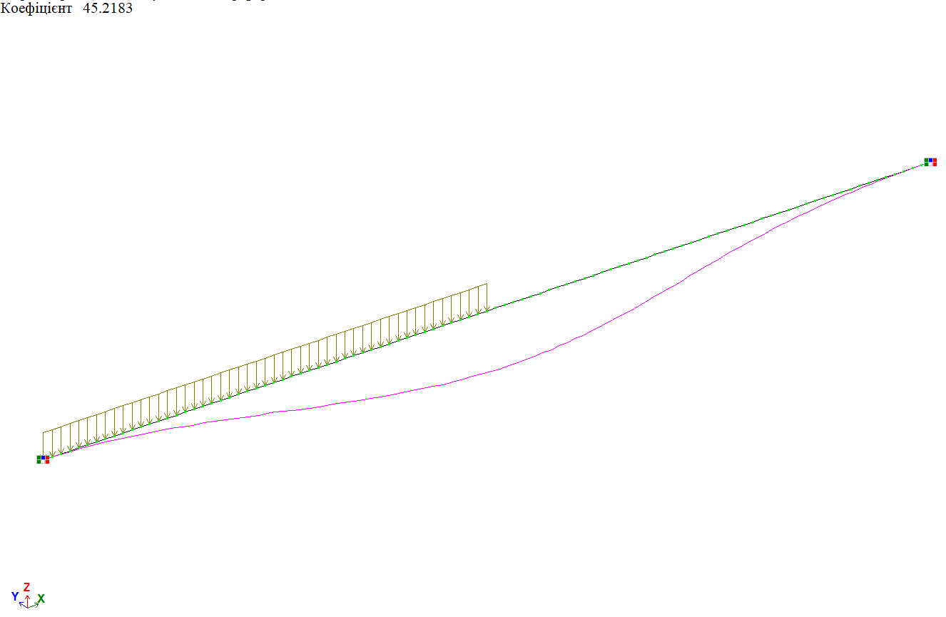 Форма втрати стійкості від дії рівномірно-розподіленого навантаження f на половині довжини балки, варіант закріплення 2