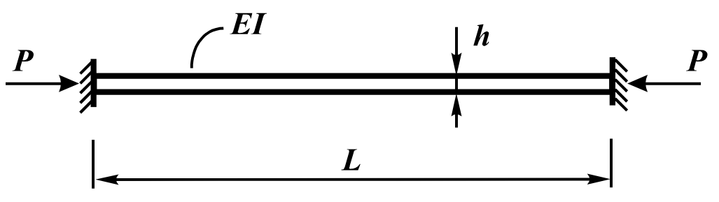 Балка квадратного поперечного перерізу, затиснена по торцях, піддається впливу зосередженої поздовжньої сили P. Визначити критичне значення зосередженої поздовжньої сили Pкр, що відповідає моменту втрати стійкості балки.