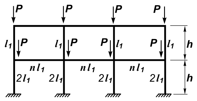 Трипролітна двоповерхова рама піддається впливу зосереджених поздовжніх сил P на стійки у вузлах сполучення з ригелями. Вузли сполучення ригелів зі стійками та вузли спирання на фундамент є жорсткими. Поздовжні жорсткості ригелів і стійок приймаються значної величини з метою унеможливлення їх впливу на вирішення задачі. Визначити критичне значення зосереджених поздовжніх сил Pкр, що відповідає моменту втрати стійкості рами.