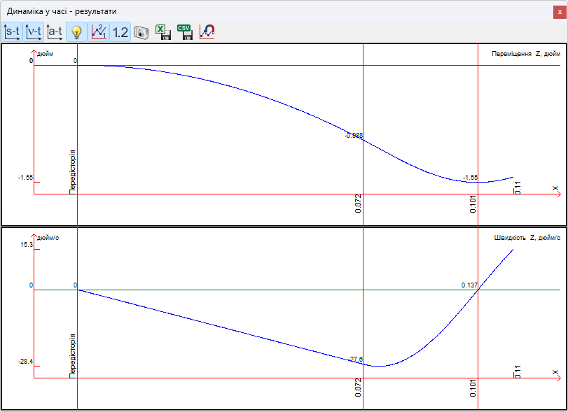 Примітка: 1 Результати аналітичного розв’язання наведено для t = 0,07198 с. Результати розрахунку в ЛІРА-САПР наведено для найближчої часової точки t = 0,072 с. 2 Результати розрахунку в ЛІРА-САПР отримані для часової точки, найближчої до моменту переходу швидкості з від'ємного на позитивне значення. |