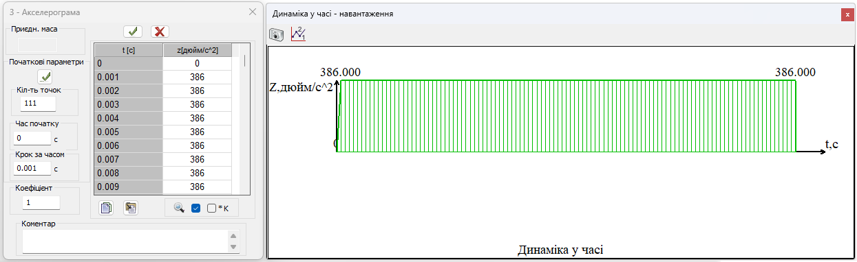 t = 0,0001 с - крок інтегрування в часі; Час інтегрування t = 0,11 c.