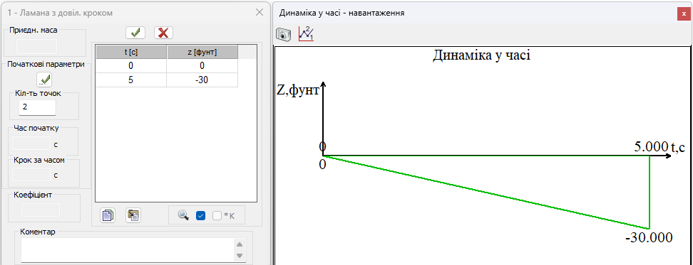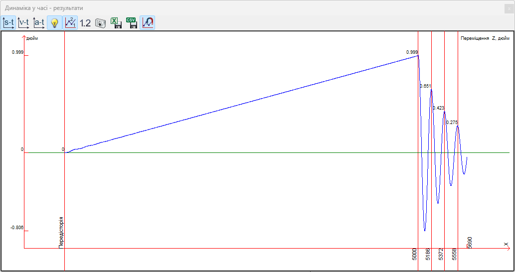 2-ге завантаження - динамічне з вагою маси. Час розв'язання після вивільнення осцилятора становить 0,69 секунд, крок інтегрування 0,001 секунди.