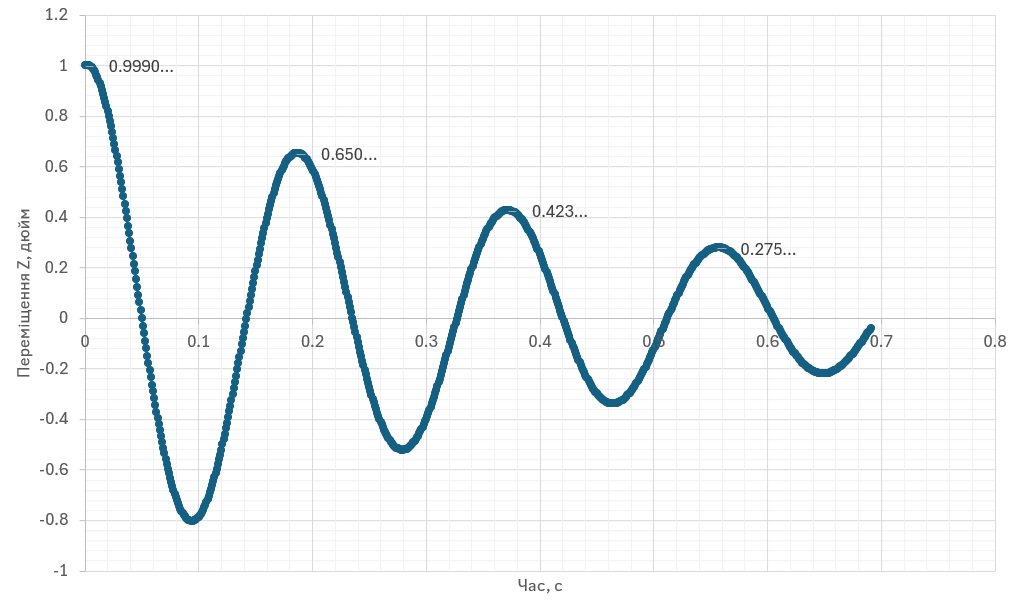 Визначити переміщення вільного кінця осцилятора в пікових точках коливання, а також декременти та періоди коливань з урахуванням згасання.
