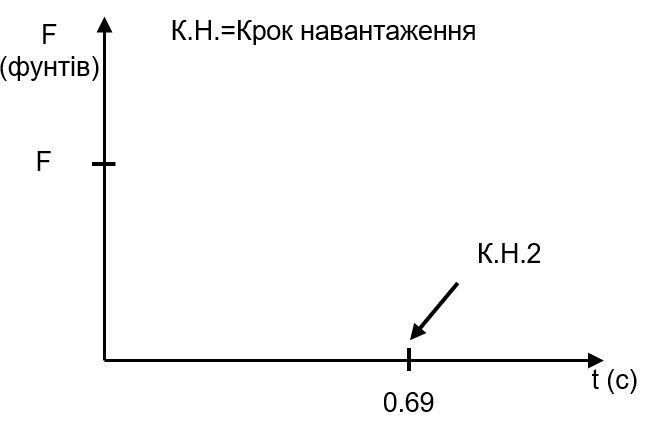 1-е завантаження – статичне, необхідне для завдання початкового відхилення від рівноваги, зусиллям Fy = 30 фунтів = 13,608 кгc. Навантаження прикладається впродовж 5 секунд, щоб одержати еквівалент статичного навантаження;