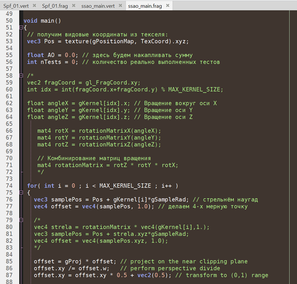 Можна закоментувати два рядки, які забезпечують розрахунок offset звичайним способом, що штатно пропонується за замовчуванням, і, навпаки, розкоментувати закоментовані рядки, які обчислюють зміщення з поворотом тестового ядра в залежності від екранної координати на псевдовипадковий кут.
