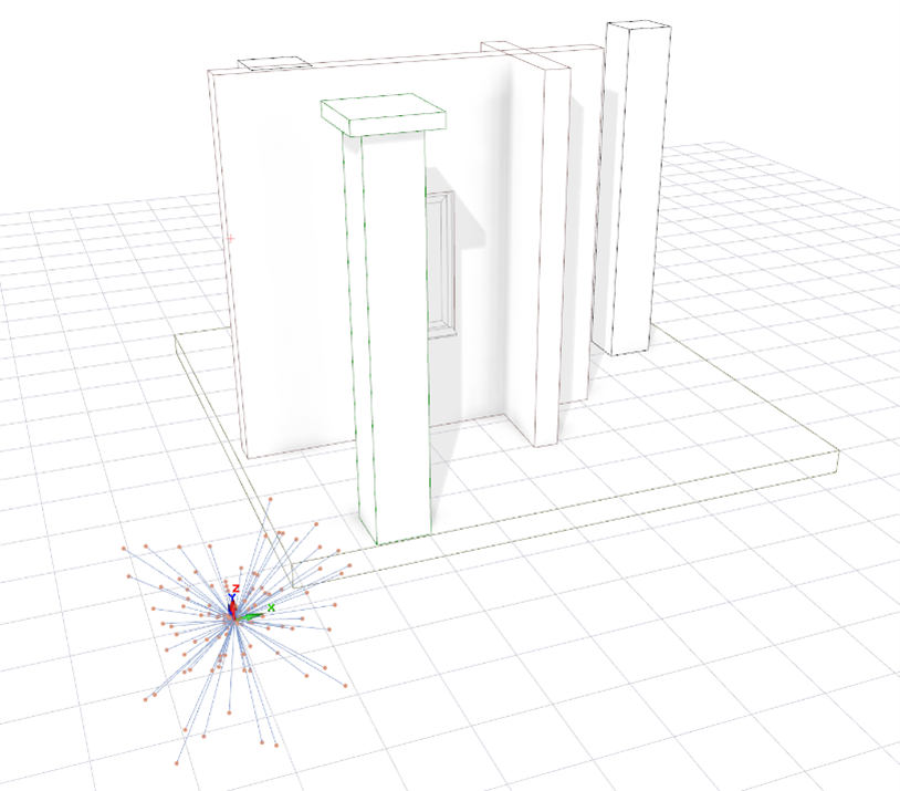 Ідеально для розрахунку розсіяного затінення в кожному пікселі зображення було б направити з відповідної йому точки поверхні об'єкта промені на всі боки і перевірити, які з них перетнуться з іншими об'єктами (затіняться), а які досягнуть небосхилу, а значить, зроблять свій внесок у освітлення. Але за такого підходу рендеринг відбувався б надзвичайно повільно. Тому ми обмежилися кількома тестовими напрямками, які вибирають випадково. Приклад такої «троянди променів» якраз і показаний на рис. 3. Результат тесту потім кількісно оцінюється і порівнюється із заданим значенням параметру Поріг розсіяного затінення. Для нього значення 0,5 є фізично обґрунтованим. Воно означає, що половина тестів, випадково спрямованих з точки на деякій поверхні, повинна опинитися всередині тіла, тобто бути затіненою, а друга половина виявитися освітленою. Якщо задати значення менше 0.5, ефект затінення буде виражений гіпертрофовано. Якщо більше 0.5, то навпаки стане менш помітним.