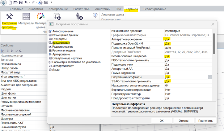 Версія LIRA-CAD 2025 базується на оновленому графічному движку, що дозволяє використовувати можливості обладнання як за стандартом OpenGL 1.1, так і за стандартом OpenGL 4.6. У тому числі, з використанням мови програмування шейдерів GLSL 4.6.