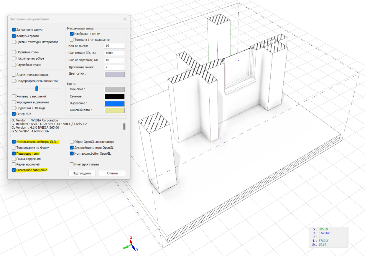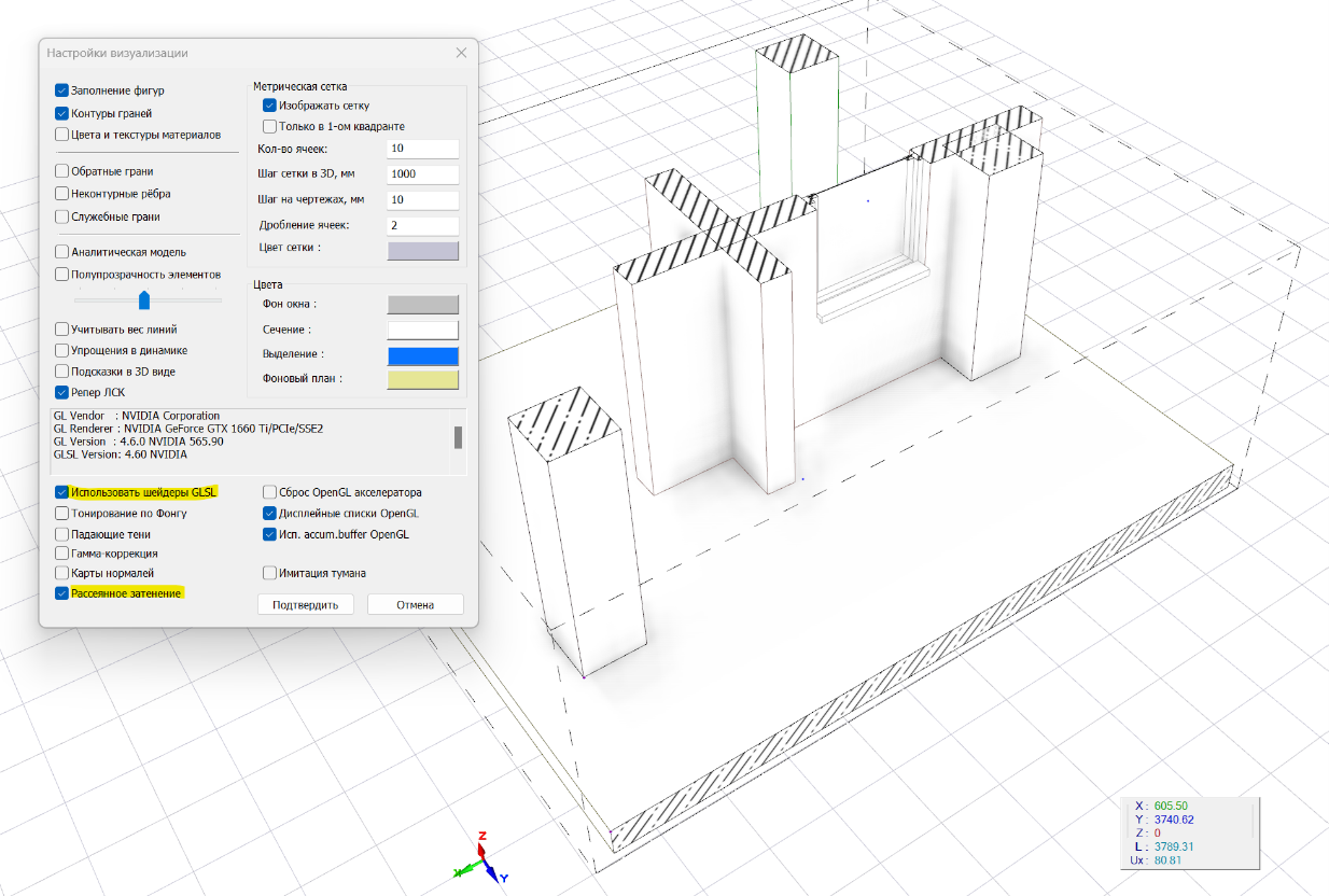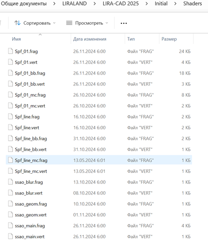 При відкритті чергового вікна графічного вигляду в LIRA-CAD створюється OpenGL контекст, в нього завантажуються шейдерні програми та компілюються з урахуванням особливостей програмно-апаратної графічної платформи, на якій виконується програма. В результаті виходить програмний код, спеціалізований для виконання саме на Вашому комп'ютері у надрах Вашої відеокарти.