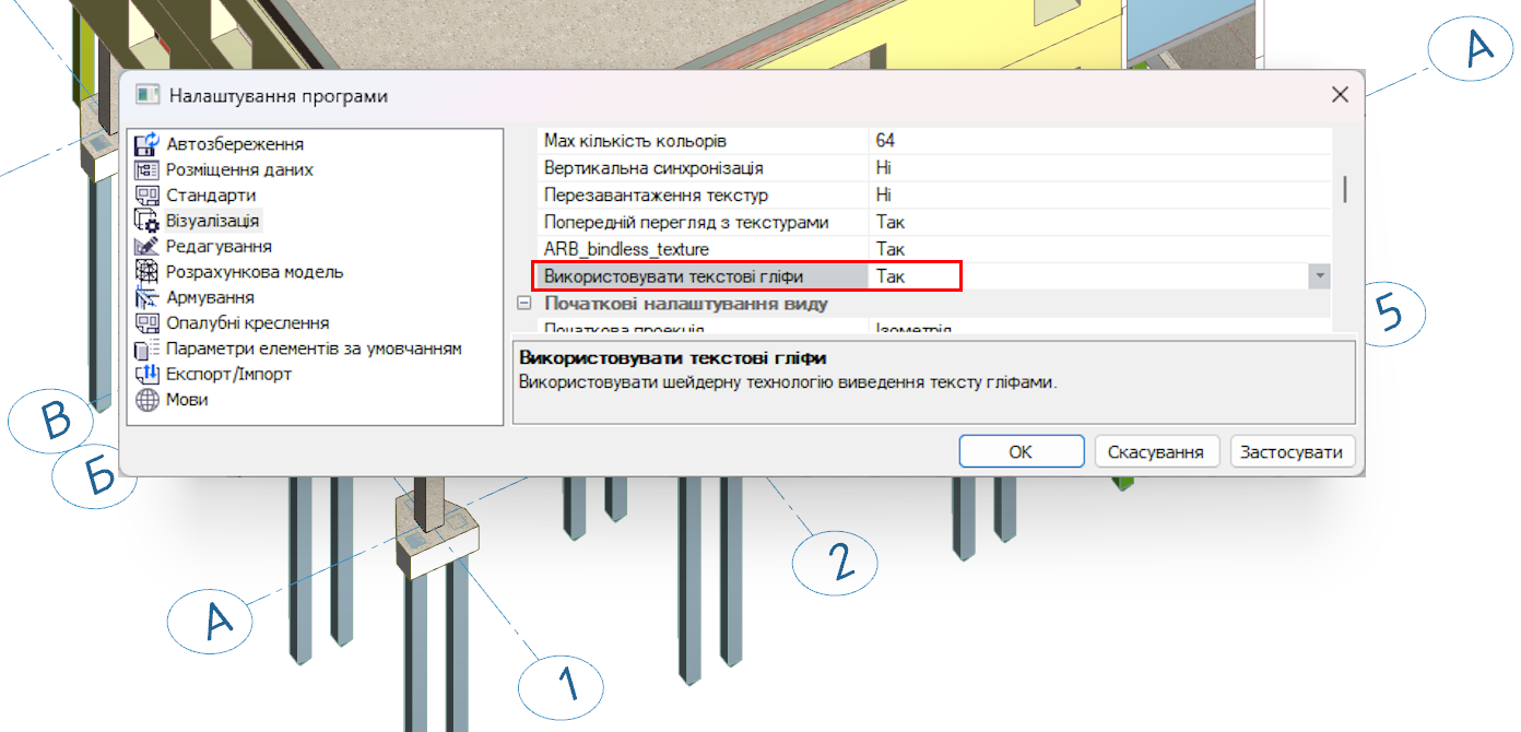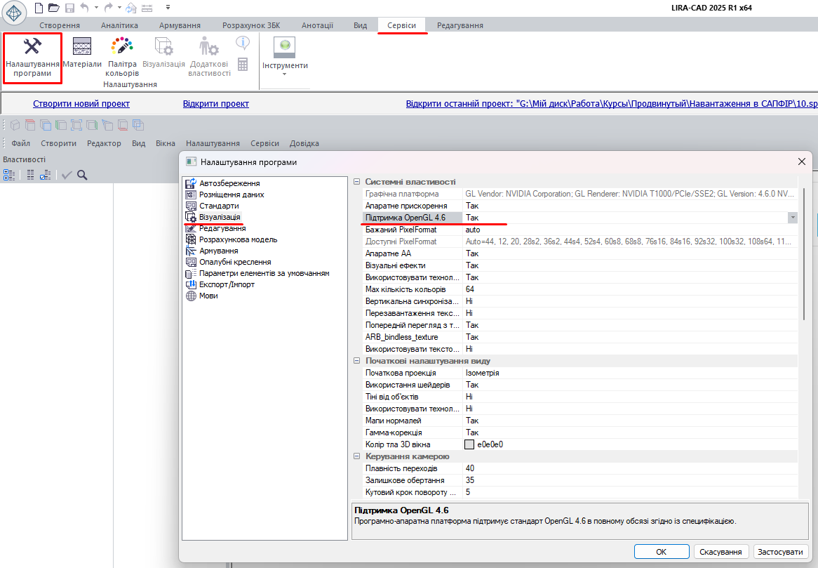 Тепер при старті LIRA-CAD зчитуватиме це значення і відповідно звертатиметься до графічної підсистеми комп'ютера в рамках історичного стандарту OpenGL 1.1.