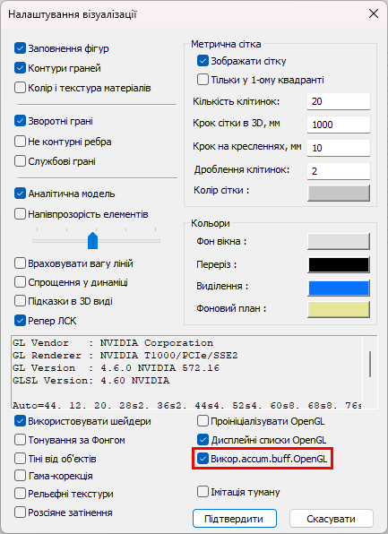Третя проблема, з описаних тут, пов'язана з нюансами підтримки окремих функцій у рамках стандарту OpenGL. Існує штатна можливість графічного обладнання, т.зв. Accumulation Buffer. Ця технологія опціонно використовується в LIRA-CAD для прискорення роботи з інтерактивними інструментами комп'ютерної графіки, такими як локатор та динамічні об'єкти. На деяких комбінаціях відеокарта/драйвер ця технологія може не підтримуватись або працювати з помилками. У разі підозри, що технологія не підтримується, її використання автоматично відключається в LIRA-CAD без можливості увімкнути. Однак, якщо формально вона підтримується, а фактично працює не коректно, її потрібно відключити вручну, використовуючи прапорець керування цією опцією в діалозі Налаштування візуалізації (див. рис. 3).