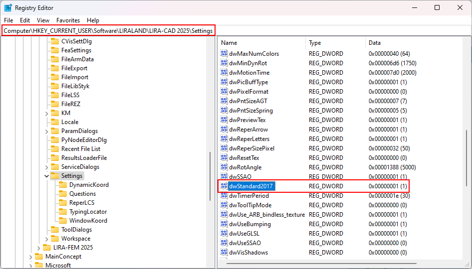 Запустіть редактор реєстру та знайдіть ключ, який відповідає налаштуванням Lira-CAD (див. рис. 2). Потрібно виправити значення змінної dwStandard2017
