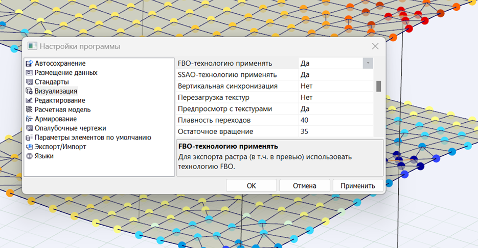 Для забезпечення ефективної та сумісної з різним обладнанням можливості експорту растрових зображень, друку в PDF і на принтер рекомендується простежити, чи включена технологія FBO.