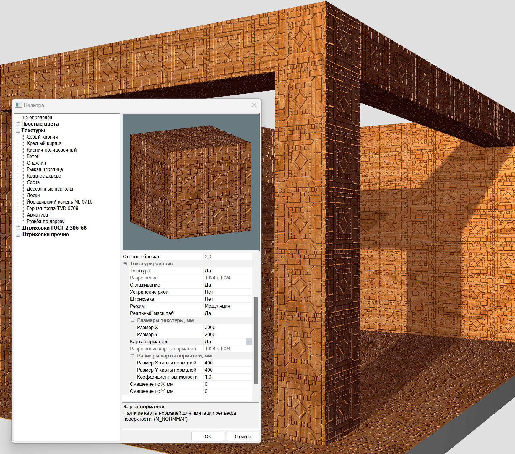 . Кожен піксель такого зображення трактується не як колір RGB, а як XYZ вектора нормалі в цій точці поверхні. Можна імпортувати такі файли для надання рельєфності поверхням об'єктів. Крім того, LIRA-CAD надає низку вбудованих інструментів для генерування карт нормалей.