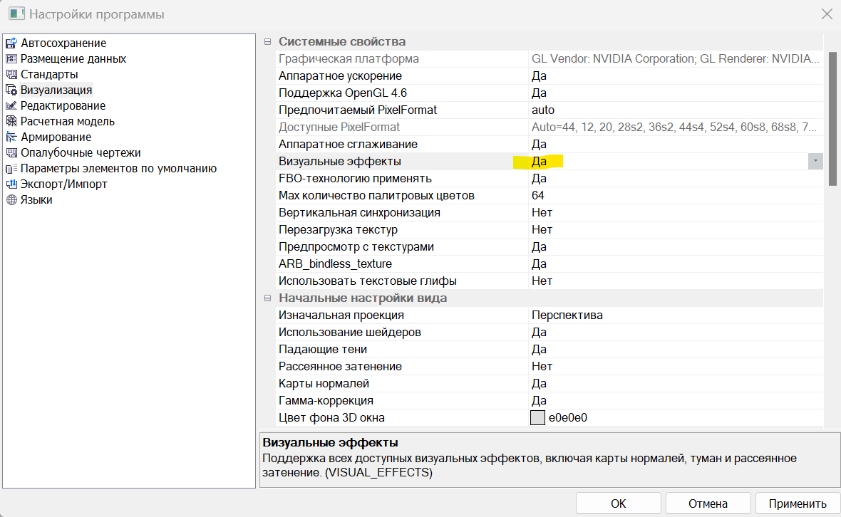 Для забезпечення відповідності кольорів скінченних елементів на зображенні розрахункової моделі кольорам клітинок діапазонів шкали рекомендується вимкнути всілякі ефекти, пов'язані з освітленням, та інші ефекти тонування. У властивостях виду слід простежити, щоб була включена візуалізація компонентів моделі, які потрібно бачити на схемі. Наприклад, АЖТ.
