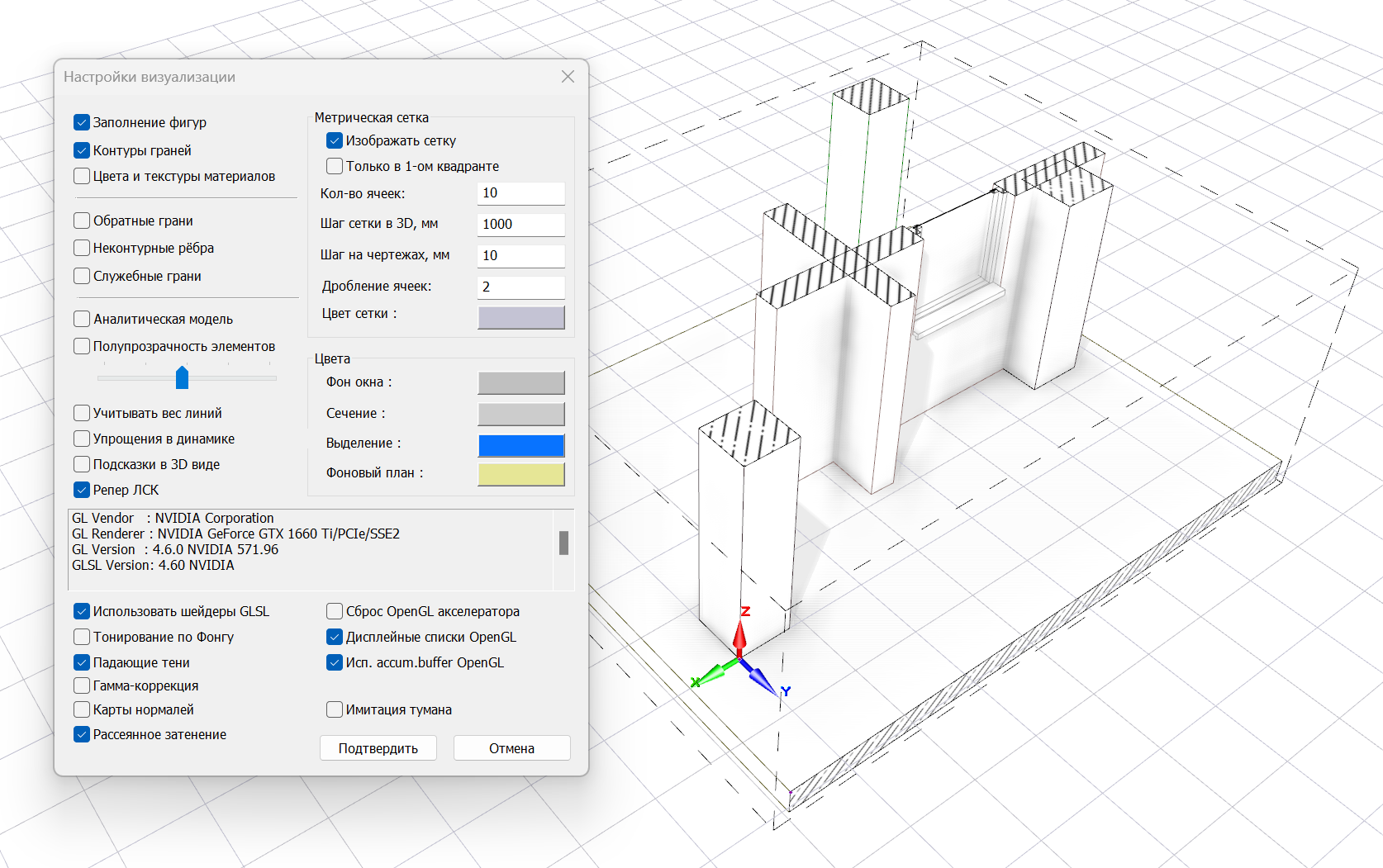 Шейдери LIRA-CAD реалізують візуальні ефекти для подання простих «чистих» кольорів, текстур, тіней, освітлення по Фонгу, повної та часткової прозорості.